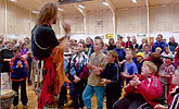 ”Nu skal vi ud at jage fugle...”, messer høvdingen dansende af sted - og hele forsamlingen på godt 200 børn og voksne gentager strofen i kor. ”For fuglene spiser vores korn...” fortsætter høvdingen, inden bruset fra de mange stemmer gentager sætningen. Regndans og solskinsdans blev det også til, og tilsyneladende lyttede vejrguderne mest til solskinsdansen.